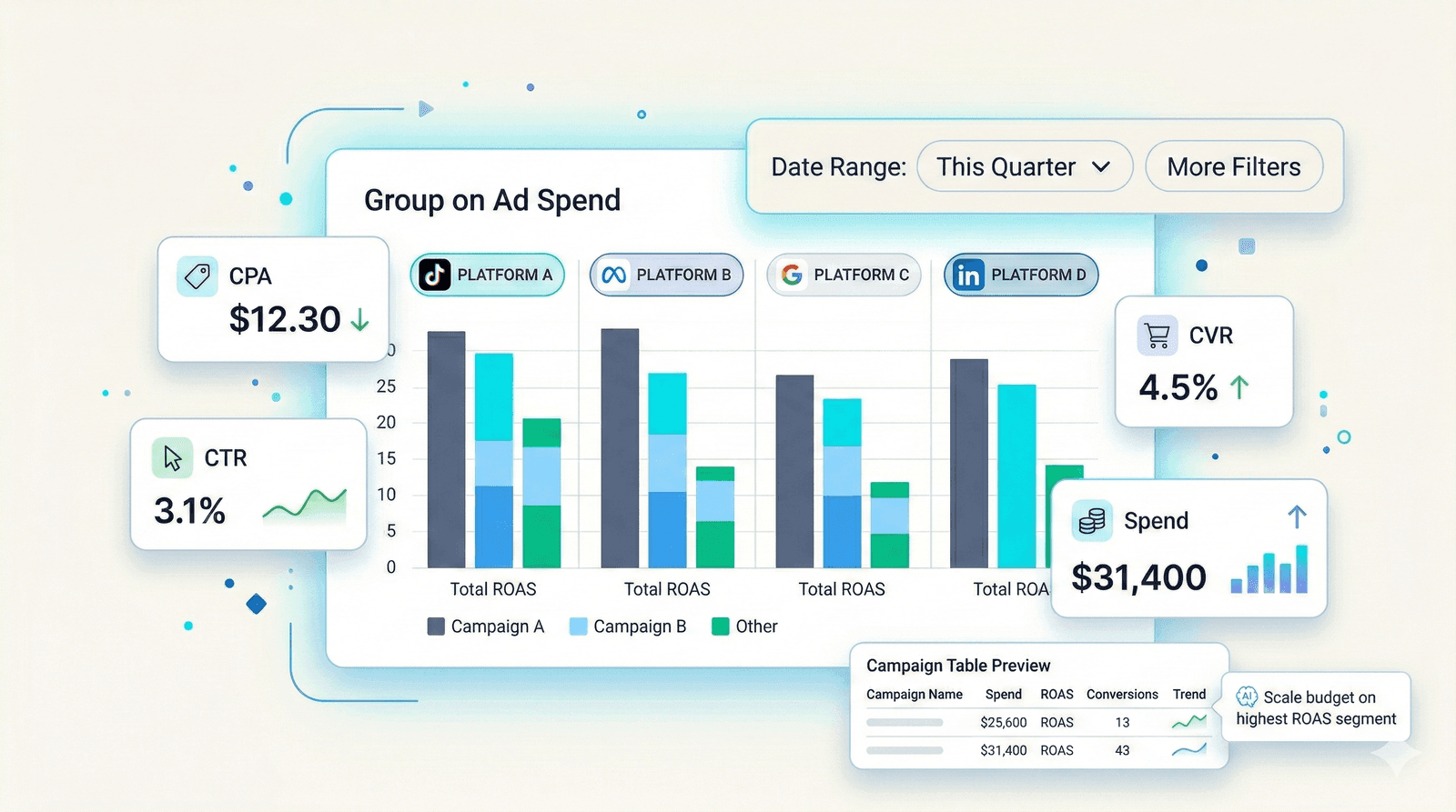 Unify campaign data and performance into one view to compare TikTok, Meta, and other channels without manual spreadsheets.